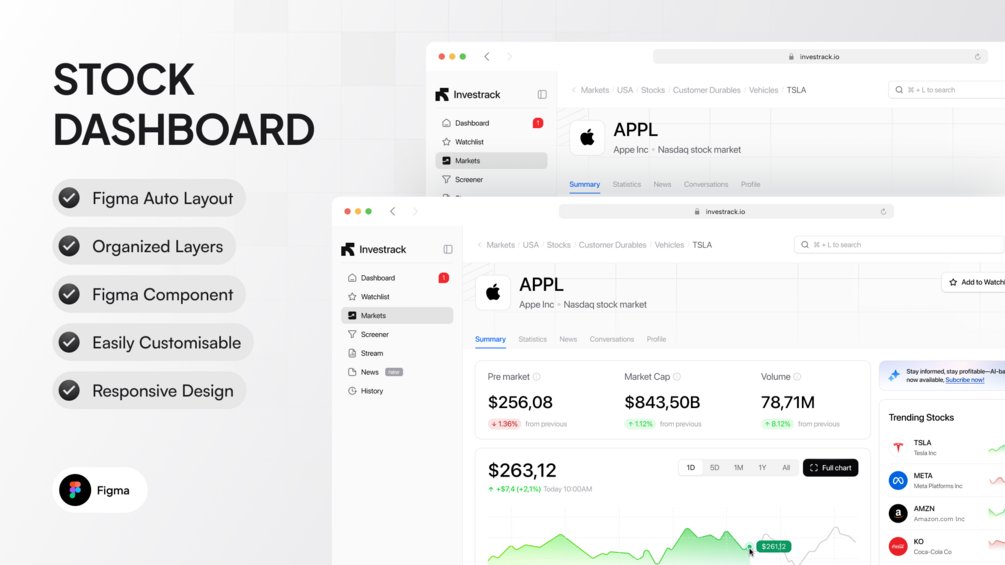The design of this stock dashboard was a collaborative effort, leveraging Figma's real-time collaboration features. The use of charts, graphs, and data visualizations makes it easy to understand key metrics, track trends, and identify potential opportunities. The dashboard empowers investors with the information they need to make informed decisions.